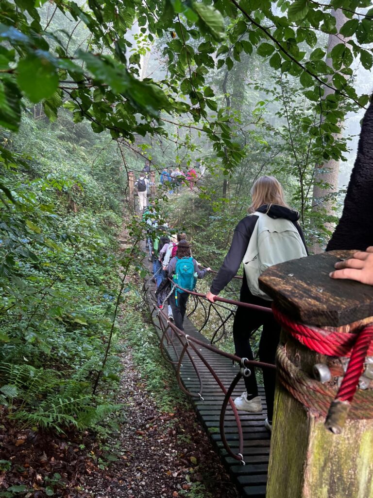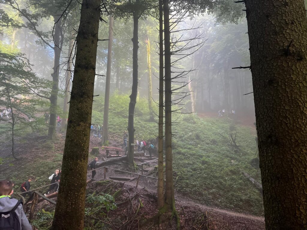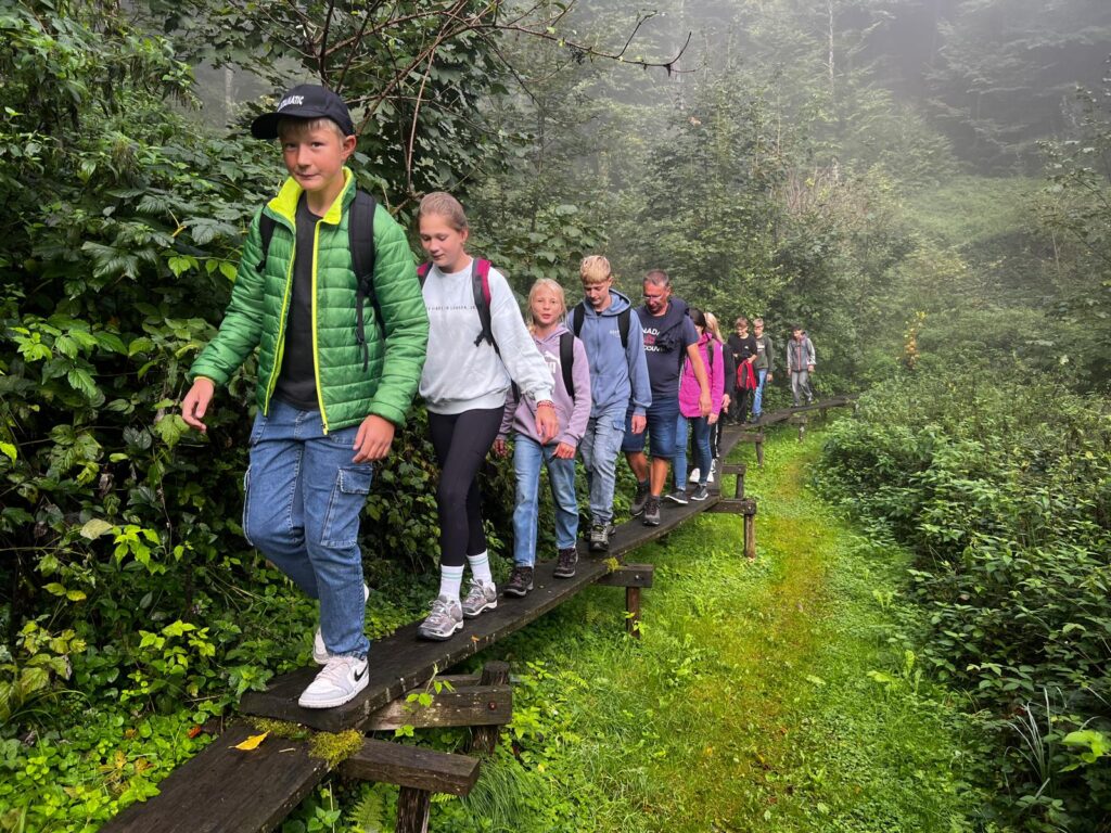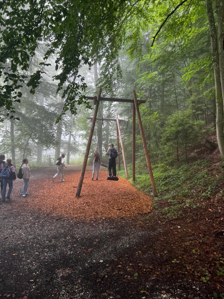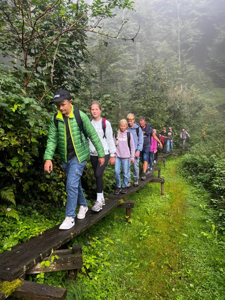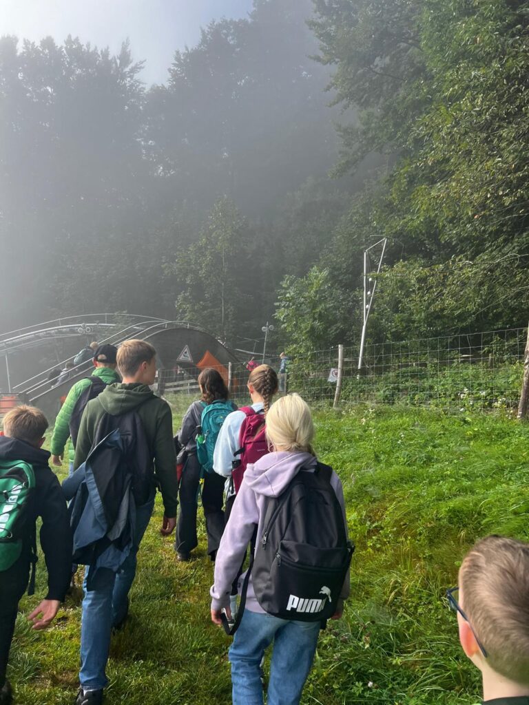 Nach einer gemütlichen Wanderung, der Erkundung der einzelnen Stationen und einer Jausenpause marschierten die Schülerinnen und Schüler noch zum Aussichtsturm. Da dieser jedoch von Nebel eingehüllt war, war die Sicht leider eingeschränkt – aber die besondere, etwas mystische Stimmung machte den Besuch trotzdem spannend.